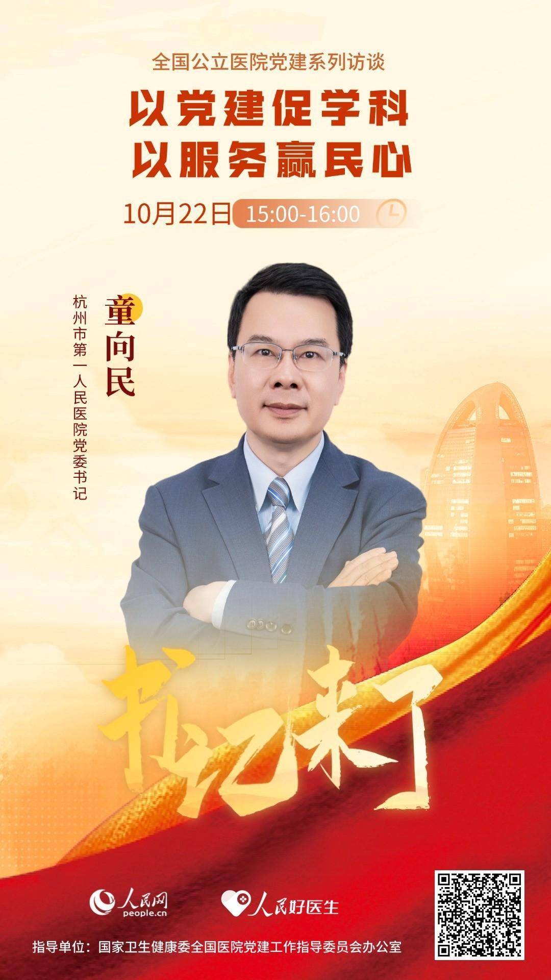 公立医院如何通过党建引领促进学科发展,助力医疗服务质量提升?10月22日15:00-16:00,杭州市第一人民医院党委书记童向民将做客《书记来了》,与大家分享医院在加强党建、促进医院高质量发展等方面的经验和做法,敬请关注。